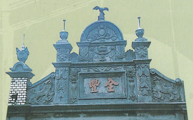 山牆頂兩隻瑞獅口咬彩帶,鯉魚躍龍門。內龍柱頂有葫蘆→避邪;有福(葫)有祿(蘆)。長發其祥,永膺多福對聯,店號上方一朵大菊花→大吉大利,花瓶插滿四季花卉,後有如意…四季平安、如意。兩旁女兒牆→獅子回首望月…思鄉、不忘本。外龍柱頂各有一盆珊瑚→聚積財富。